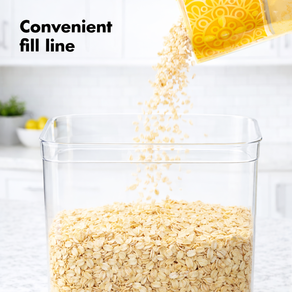 The clear, durable body allows you to see contents at a glance, making it easy to identify grains, cereal, oats, coffee beans, pasta, snacks, and more. Its stackable design maximizes vertical space, helping you build a clean and efficient pantry or countertop setup.